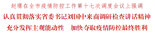 趙璟指出,在我市疫情防控掃尾階段,省委書記劉國中再次來商調(diào)研檢查,充分肯定我市近期工作成效,對我們一鼓作氣打贏疫情防控殲滅戰(zhàn)提出要求,充分體現(xiàn)了省委對商洛工作的高度重視和對全市干部群眾的深切關(guān)懷。全市上下要堅(jiān)持“外防輸入、內(nèi)防反彈”總策略和“動態(tài)清零”總方針,認(rèn)真貫徹落實(shí)劉國中同志講話精神,增強(qiáng)“時時放心不下”的責(zé)任感,充分發(fā)揮主觀能動性,始終保持良好狀態(tài),加壓加速、奮力沖刺,堅(jiān)決奪取疫情防控最終勝利,為黨的二十大勝利召開營造安全穩(wěn)定的社會環(huán)境。