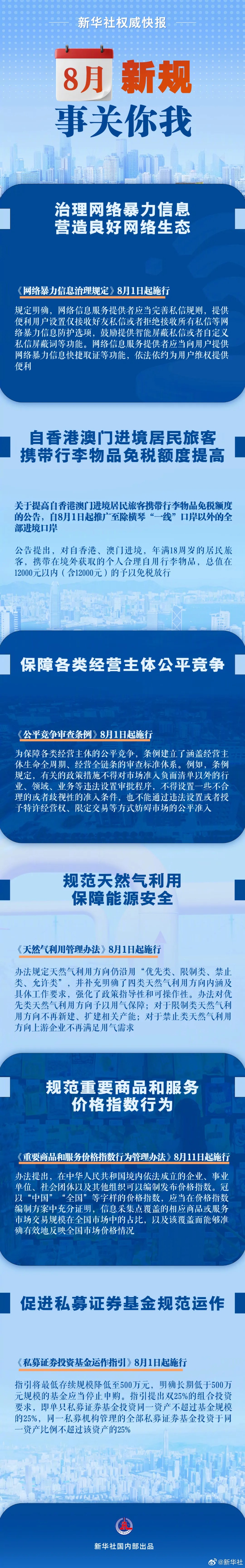 明確網(wǎng)絡(luò)信息服務(wù)提供者應(yīng)當(dāng)完善私信規(guī)則;保障各類經(jīng)營(yíng)主體公平競(jìng)爭(zhēng);進(jìn)一步規(guī)范天然氣利用,保障能源安全……8月新規(guī),事關(guān)你我,一起來看。