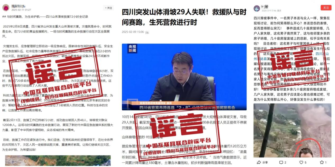 2月9日,有網(wǎng)民在某網(wǎng)絡(luò)平臺發(fā)布題為《30人被埋!四川山體崩塌瞬間曝光,行車記錄儀拍下死神奪命10秒》的帖文。經(jīng)核實(shí),帖文配圖均為嫁接舊聞、圖文翻炒,網(wǎng)民將2024年8月茂縣山體滑坡救援現(xiàn)場、2016年12月宜賓市長寧縣下長鎮(zhèn)永利村一村民被推土機(jī)掩埋致死事件的舊聞重新拼接合成,編造為宜賓筠連山體滑坡最新動態(tài)后發(fā)布。(來源:四川互聯(lián)網(wǎng)舉報(bào)辟謠平臺、宜賓網(wǎng)警)
