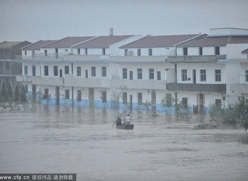 決堤造成羅針鎮(zhèn)、唱凱鎮(zhèn)受災(zāi)嚴(yán)重。22日下午,記者隨南京軍區(qū)救援部隊坐沖鋒艇進(jìn)入羅針鎮(zhèn)附近村莊解救被困群眾,只見福銀高速兩旁的村莊全部被淹,方圓百里,已成汪洋一片,被淹區(qū)域平均水深1至2米;在低洼處,許多兩層高的房子被水淹的只見屋頂,緊急趕至的各路大軍駕駛沖鋒舟、橡皮艇小心穿梭其中,接運(yùn)受困民眾。