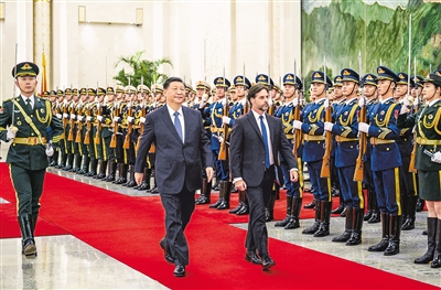 十一月二十二日下午,國(guó)家主席習(xí)近平在北京人民大會(huì)堂同來華進(jìn)行國(guó)事訪問的烏拉圭總統(tǒng)拉卡列舉行會(huì)談。這是會(huì)談前,習(xí)近平在人民大會(huì)堂北大廳為拉卡列舉行歡迎儀式。 |