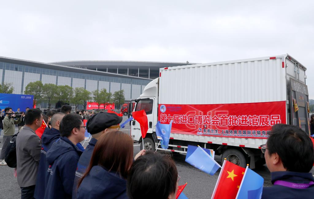 10月22日,裝載首批進(jìn)館展品的卡車駛?cè)雰x式現(xiàn)場(chǎng)。當(dāng)日,第七屆中國(guó)國(guó)際進(jìn)口博覽會(huì)首批展品進(jìn)館儀式在國(guó)家會(huì)展中心(上海)舉行。新華社記者方喆攝