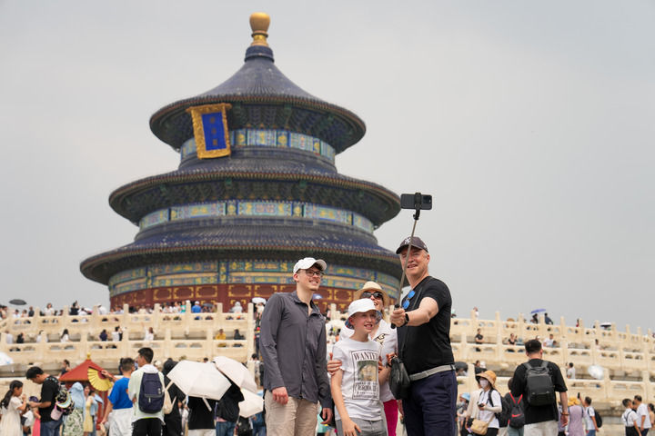 2024年7月9日,來自瑞士的游客在北京天壇公園祈年殿前合影。新華社記者 鞠煥宗 攝