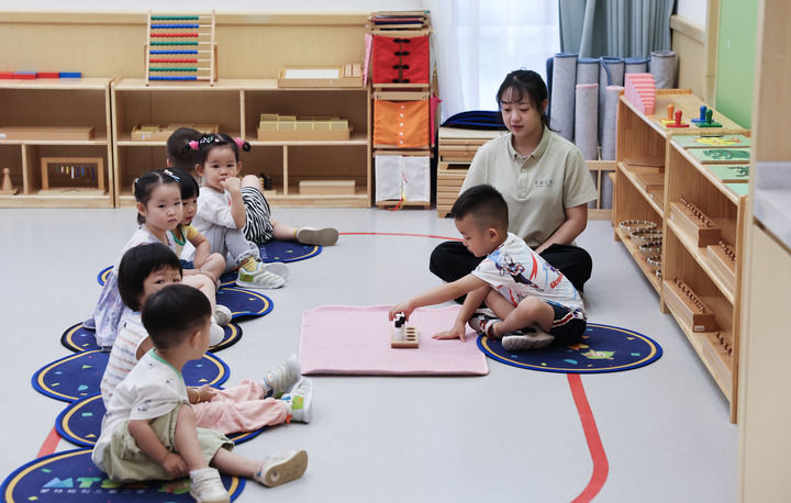 2024年8月20日,在嘉興市南湖區(qū)東柵街道的一家托育機(jī)構(gòu)里,小朋友在上課。新華社記者 徐昱 攝