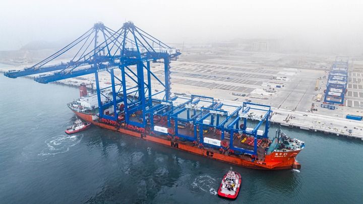 2024年6月27日,岸邊集裝箱起重機(jī)和軌道吊運(yùn)抵秘魯錢凱港。新華社發(fā)(上海振華重工供圖)