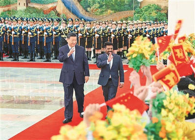 會(huì)談前,習(xí)近平在人民大會(huì)堂北大廳為迪薩納亞克舉行歡迎儀式。