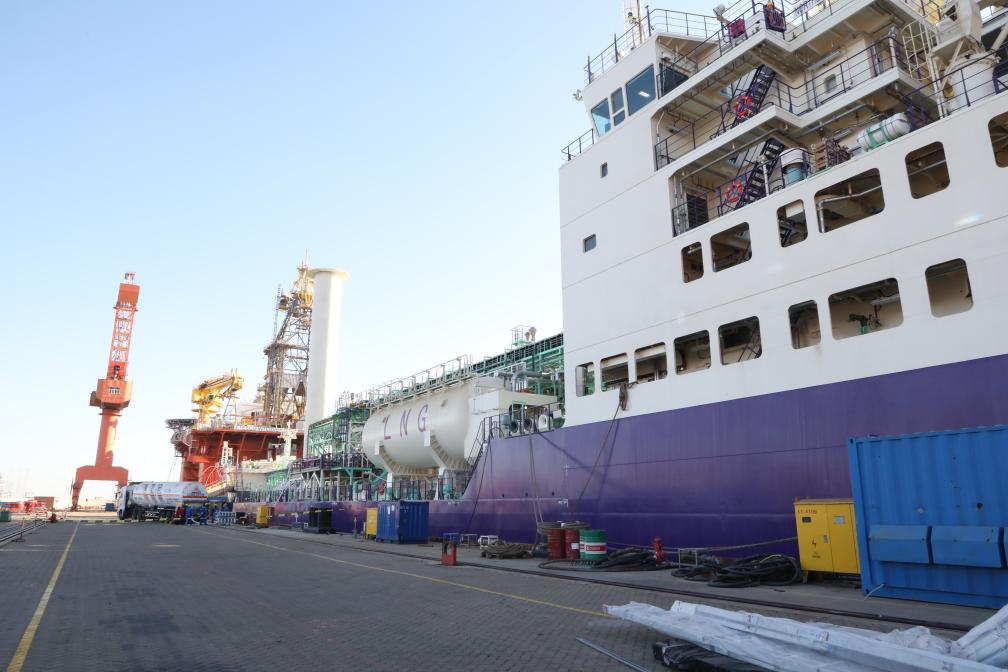 1月2日,在大連船舶海洋工程有限公司,一輛LNG運(yùn)輸卡車正在為“北極探路者”運(yùn)輸船進(jìn)行保稅LNG燃料加注。(遼寧自貿(mào)試驗(yàn)區(qū)大連片區(qū)管委會(huì)供圖)