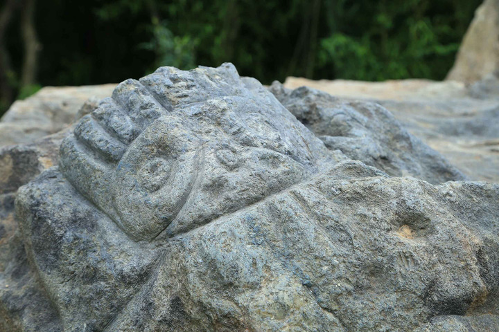 2015年,當(dāng)?shù)貙ι褶r(nóng)部落旅游資源進(jìn)行調(diào)查時,偶然發(fā)現(xiàn)了多處巖石上的凹穴。在桐柏山上竹林環(huán)繞的半山腰處,一塊巖石上赫然可見一處形似人面像的巖畫——“頭頂”約有10條線狀紋飾,組成“皇冠”的圖案;面部的圓環(huán)和圓點(diǎn),表示“雙眼”;下部5條射線狀紋飾,恰似“胡須”。這一長20厘米、寬27厘米的人面像,是隨州發(fā)現(xiàn)的石器時期最為具象的巖畫,被當(dāng)?shù)厝朔Q為“太陽神”,也有人稱他為“炎帝神農(nóng)像”。