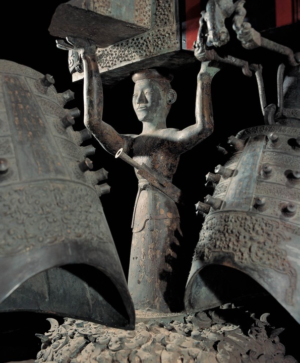 展廳正中,三層八組65件青銅編鐘的原件,巍然懸掛在曲尺形的銅木鐘架上。近5噸的重量全部由6個青銅佩劍武士立柱支撐,歷經(jīng)2400多年穩(wěn)如泰山。