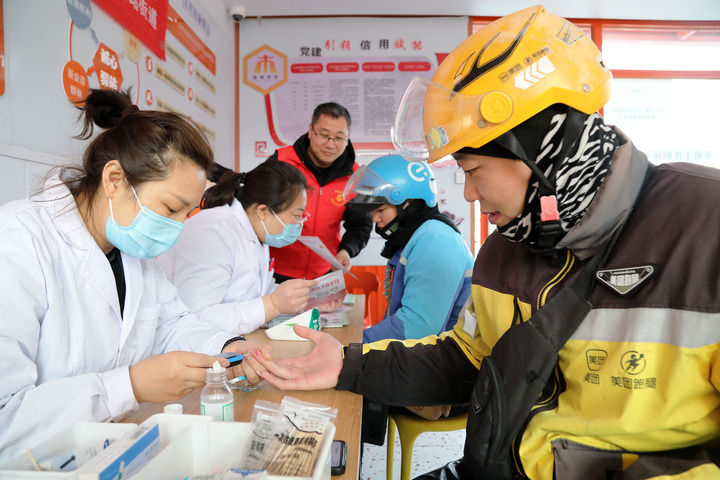 2025年3月5日,志愿者在山東省棗莊市市中區(qū)一工會(huì)驛站為外賣(mài)員免費(fèi)測(cè)量血糖。新華社發(fā)(王海楠攝)