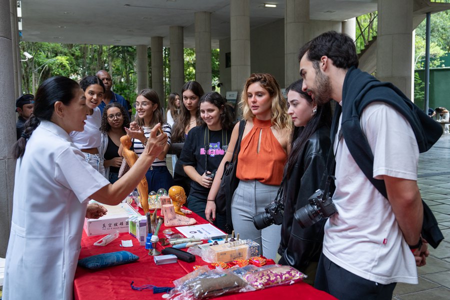 2025年4月15日,在巴西里約熱內盧天主教大學舉辦的“國際中文日”慶?;顒由希瑢W生們觀看中醫(yī)療法展示。新華社記者 王天聰 攝