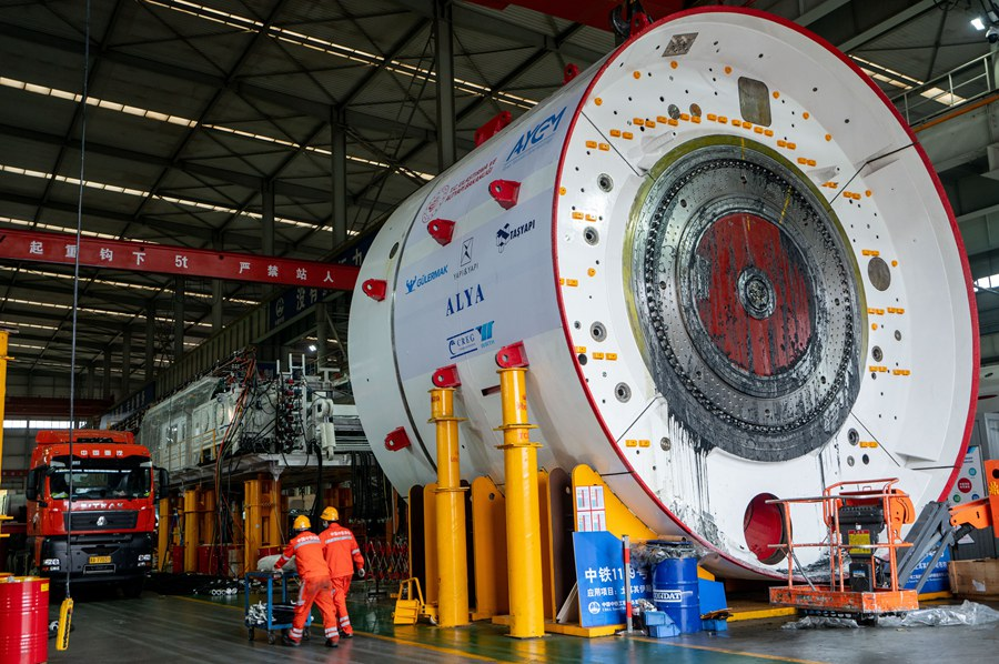 2022年11月23日,工人在中鐵裝備集團(tuán)車(chē)間內(nèi)運(yùn)輸掘進(jìn)機(jī)零部件。新華社發(fā)