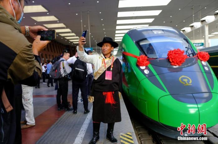 資料圖:民眾在拉薩火車站復興號車頭前拍照留念。 中新社記者 江飛波 攝