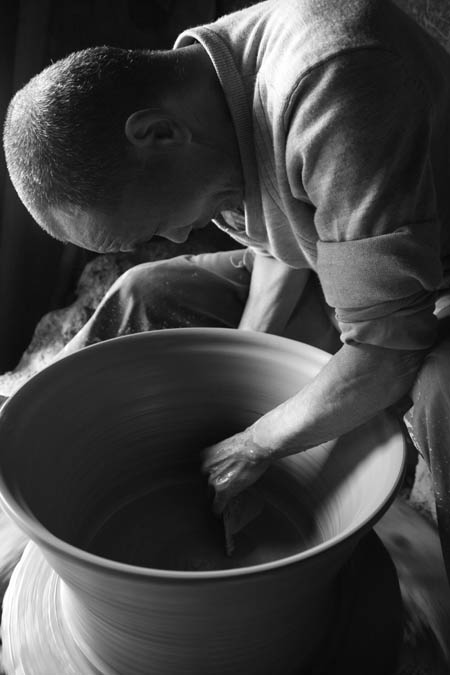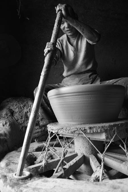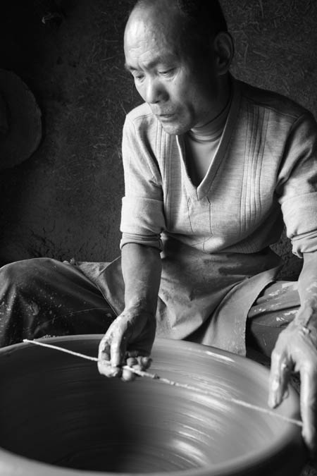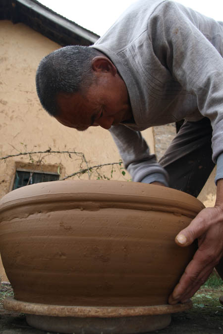 制陶的程序并不復(fù)雜,經(jīng)和泥、盤泥、臥泥,然后開(kāi)始制作,晾曬到燒制。制作將泥放在輪盤上,用腳轉(zhuǎn)動(dòng)輪盤,雙手仔細(xì)變化手勢(shì),泥在郝悶長(zhǎng)的手中不斷的變化各種形態(tài)。