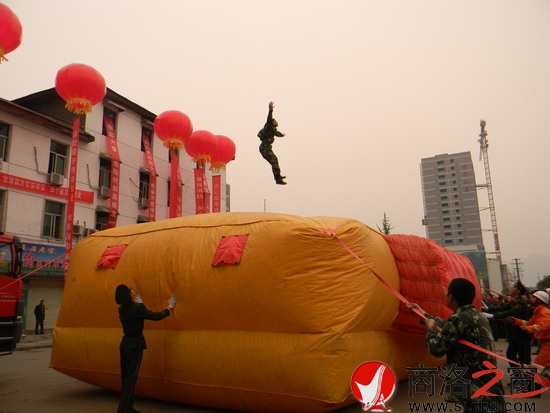 隨后,他們還表演了利用救生氣墊逃生和消防車射水演示。