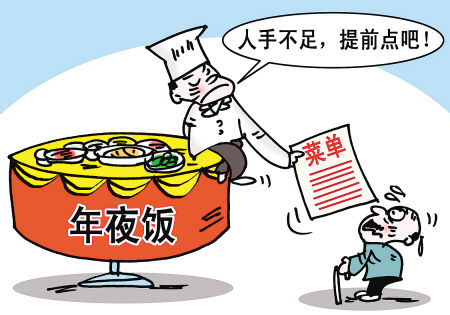 據(jù)錦都酒店的餐飲部工作人員說,今年的訂餐從2010年12月初就開始了,他們準(zhǔn)備了六七十桌,元月中旬就已經(jīng)訂滿。為了解決餐位緊張的情況,各大飯店紛紛采取了分時(shí)段預(yù)訂年夜飯的措施。