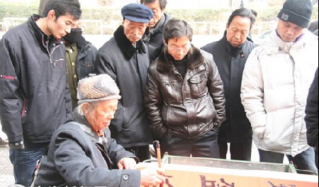 記者在工農(nóng)路一春聯(lián)攤前看到,很多市民聚在一起有說有笑,走近一看,原來是一位師傅正在現(xiàn)場書寫春聯(lián)。“看看,人家這是半自動化操作呢。”大家都對這位師傅寫春聯(lián)的工具產(chǎn)生極大興趣,兩張長桌子并在一起,鋪上紙,用一個大夾子夾住春聯(lián)紙的一端,用一根細繩拴在夾子上,寫春聯(lián)的時候,只要輕輕拉繩子一端,紙就自動移上去了。在別處,都是兩個人才能撐起一個攤子,一個人寫,另外一個在旁邊幫忙移動紙,而這位師傅一個人就把一切都搞定了。