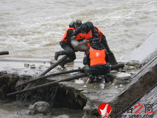 13日一大早,兩岸何堤危險(xiǎn)處被拉起了警戒線,武警官兵出現(xiàn)在了搶險(xiǎn)第一線。由于水流湍急,只能采用鐵絲籠裝沙袋填埋沉陷處和被淘空基石的措施防止洪水進(jìn)一步肆虐。武警官兵們緊張地裝沙袋,再將沙袋裝進(jìn)鐵絲籠中,裝載機(jī)將裝好沙袋的鐵絲籠拋入沉陷坑內(nèi)。由于基石下被水淘蝕,裝載機(jī)不能準(zhǔn)確地將沙袋放入,所以武警官兵必須下去站在僅剩的基石上將沙袋放進(jìn)被淘空處。洪水咆哮,大雨無(wú)情。河堤上的人為站在基石上的武警官兵捏著一把汗,岸上的武警戰(zhàn)士小心地將沙袋沿著斜坡滾到基石上,下面的官兵迅速將沙袋裝入放在洪水中的鐵絲網(wǎng)內(nèi)。由于水流沖擊力大,武警戰(zhàn)士不得不用撬杠張開(kāi)鐵絲籠口,沉重的沙袋在肆虐的洪水中如困獸般與武警戰(zhàn)士較量著,兩名戰(zhàn)士不得不壓低身體,幾乎是趴在撬杠上奮力地張著鐵絲網(wǎng)。