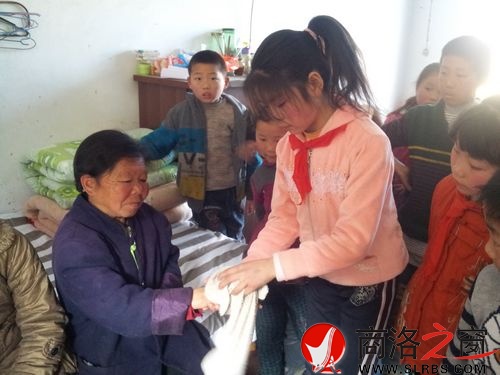 3月5日下午,商州區(qū)劉灣辦事處任塬小學的學生在敬老院為趙淑芳老人擦洗。(見習記者 李亮 肖云 攝)