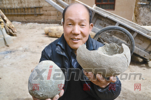 3月13日,記者在古城鎮(zhèn)某學(xué)校李老師家里看到,這枚圓石形狀較為怪異,狀如人頭模樣,外面有石質(zhì)外殼,外殼和圓石可分離,外殼厚約2.5厘米,最薄處為1厘米;圓石直徑約16厘米,重約4公斤。據(jù)介紹,這枚圓石是從沙河河灘挖出來的。經(jīng)比對,與網(wǎng)上的恐龍蛋化石圖片很相似。所以不少人認(rèn)為可能就是一枚恐龍蛋,洛南幾位文物考古學(xué)者也贊同這一觀點,不過他們也表示,需要更為專業(yè)的鑒定才能確定是否為恐龍蛋化石。(西安晚報 張紅中)