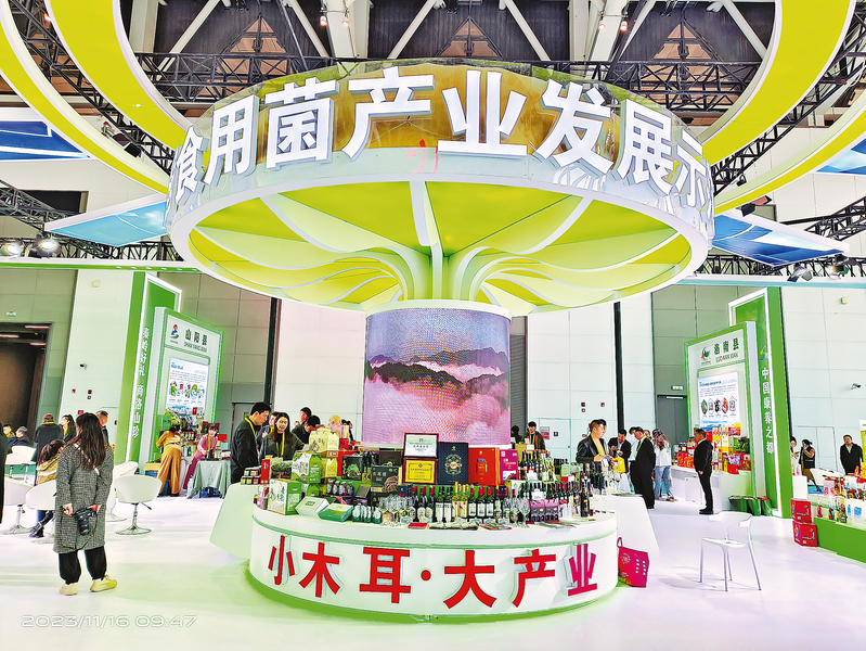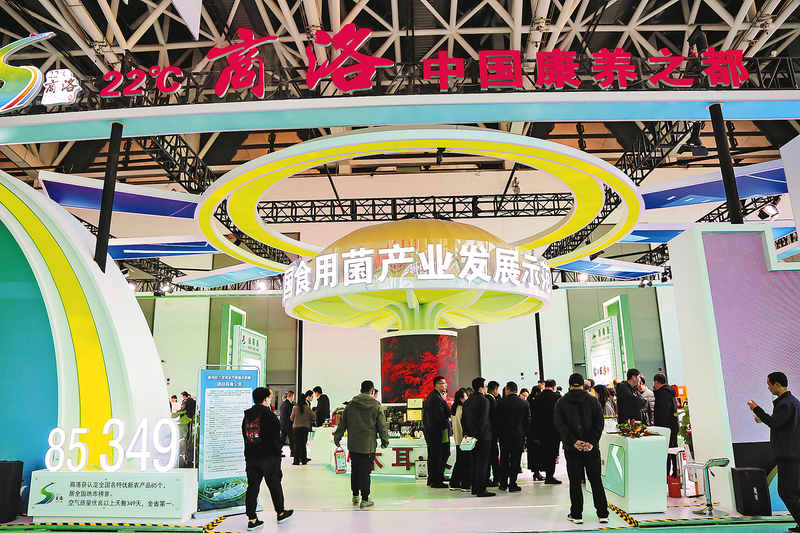 踏上絲綢路,走向大市場(chǎng)。11月16日,開(kāi)幕式當(dāng)天,眾多客商和游客紛紛走進(jìn)商洛展區(qū),映入眼簾的是巨型香菇造型下擺放著各式各樣的商洛農(nóng)副產(chǎn)品。