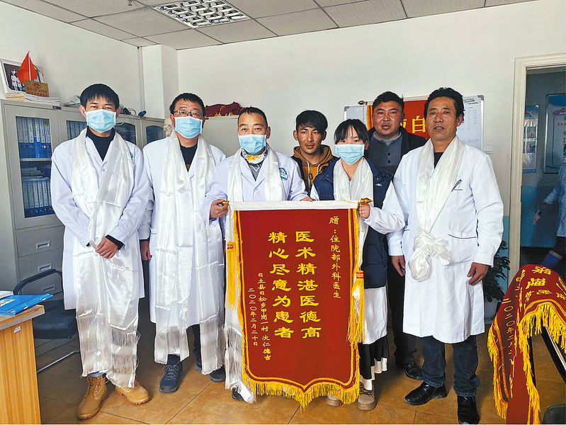 2020年2月,康復(fù)患者為趙岳峰(左三)和援藏醫(yī)療團(tuán)隊(duì)敬獻(xiàn)哈達(dá)和錦旗。
