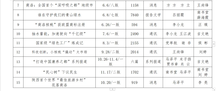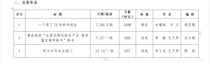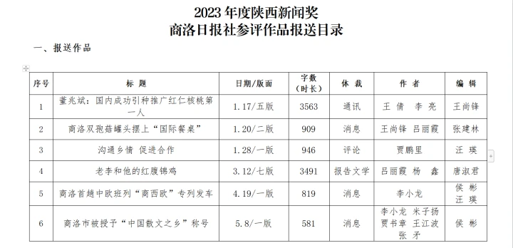 根據(jù)《關(guān)于開展2023年度陜西新聞獎、陜西省優(yōu)秀新聞工作者評選的通知》文件精神以及市記協(xié)相關(guān)文件要求,商洛日報社組織評選推薦參評作品,經(jīng)研究決定,擬報送推薦參評作品15件,自薦作品3件,現(xiàn)進(jìn)行公示。若對公示對象有異議的,可在公示期內(nèi)向總編辦反映。