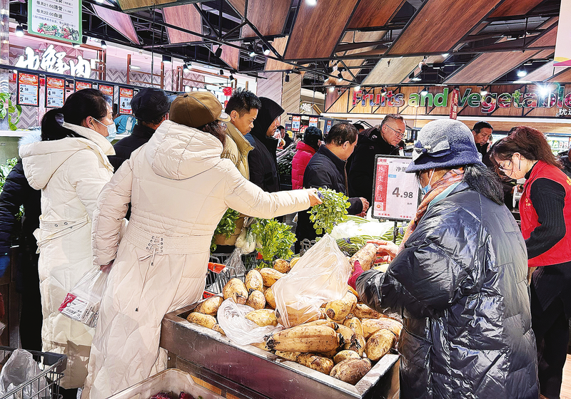 “超市已做足年貨保供工作,除了肉菜、禽蛋、海鮮等農(nóng)副產(chǎn)品,各類酒飲、零食小吃也很受消費者歡迎,客流量明顯增多。”超市店長何飛介紹,最近一周,超市每天銷售蔬菜有六七噸,糧油在兩噸左右。每天的進貨量有兩大車近30噸,銷售最高峰預(yù)計會出現(xiàn)在春節(jié)前3天。就目前的銷售情況來看,年前市場消費已進入火熱期。