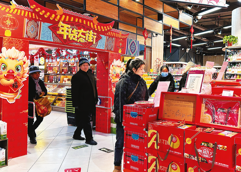 2月2日,小年當天,記者在多家超市、商場看到,到處張燈結(jié)彩,琳瑯滿目的商品整齊地擺放在貨架上。新鮮蔬菜、米面糧油、糖果點心、酒水飲料、龍元素飾品等一應(yīng)俱全。各類展板上寫滿了折扣、滿減滿贈等讓利活動的文字,前來采購的市民絡(luò)繹不絕。在一首首迎新年歡快歌曲的烘托下,消費市場的年味越來越濃。
