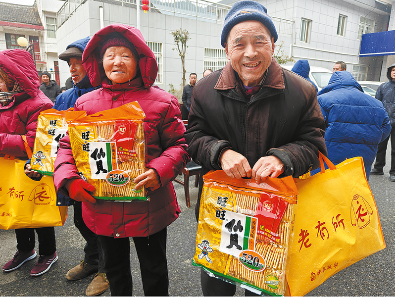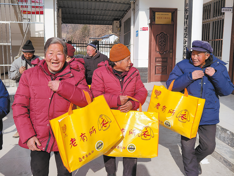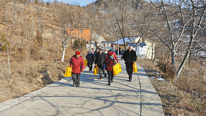 1月29日,山陽(yáng)縣十里鋪街道磨溝里村的老人們喜氣洋洋地帶著溫暖包回家。