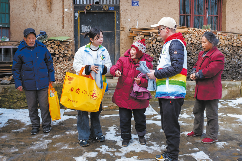 1月20日,志愿者上門為偏遠(yuǎn)山村的老人送去溫暖包。