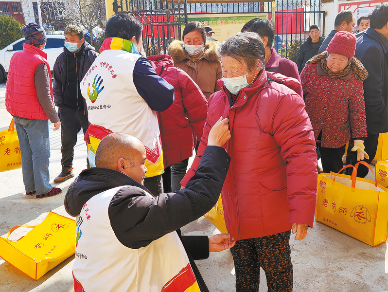 1月26日,志愿者為商州區(qū)大荊鎮(zhèn)口前村的老人們?cè)嚧┯鸾q服。