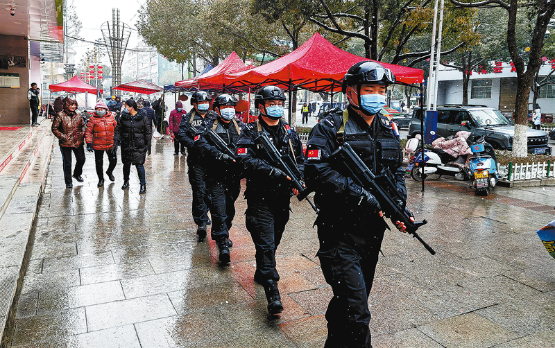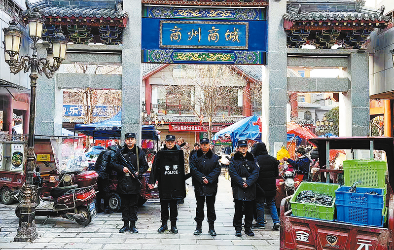 春節(jié)前后,公安商州分局在市區(qū)重點(diǎn)部位和人員密集場(chǎng)所安排武裝巡邏。圖為2月7日民警在商州商城維護(hù)秩序。