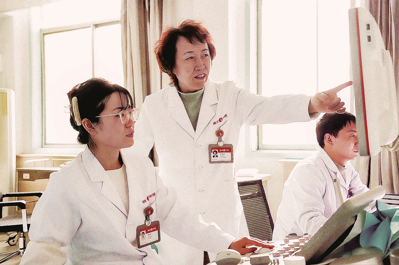 ▽從醫(yī)40多年來,趙冬麗(中)始終默默耕耘在臨床一線,她善待每一位患者,對腹部、心臟、血管、甲狀腺、乳腺等超聲診斷有獨到之處,為患者的治療提供了超聲診斷依據(jù),給臨床提供了可靠信息,為搶救病人贏得了寶貴的時間。圖為3月4日,市中醫(yī)醫(yī)院超聲醫(yī)學(xué)科主任醫(yī)師趙冬麗指導(dǎo)科室醫(yī)師為病人進行B超檢查。
