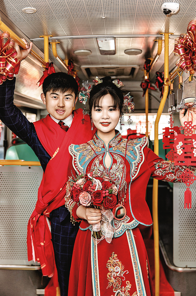 3月11日,一輛車(chē)身貼滿囍字、車(chē)內(nèi)掛滿彩帶裝飾的5路公交車(chē),在洛南縣劉澗社區(qū)河濱北路緩緩行駛,吸引了眾多市民的目光。車(chē)上載著新郎張園濤和新娘田添的迎親親友團(tuán),一路歡歌駛向了舉辦儀式的酒店,這種別致又低碳的迎親形式成了當(dāng)?shù)亟诸^的焦點(diǎn)。