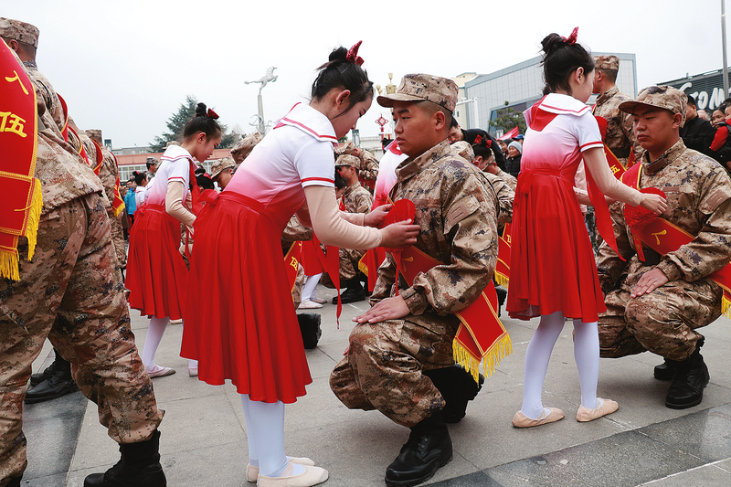 ?3月15日,丹鳳縣舉行新兵歡送儀式,組織少先隊(duì)員為入伍新兵佩戴大紅花,開展青少年國防教育,營造“讓軍人成為全社會(huì)尊崇的職業(yè)”濃厚氛圍。圖為少先隊(duì)員為入伍新兵佩戴大紅花。 (本報(bào)通訊員 楊 莉 攝)