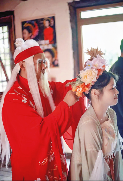 在柞水縣終南山寨,漢服體驗(yàn)館老板身穿月老服飾,為顧客簪花。