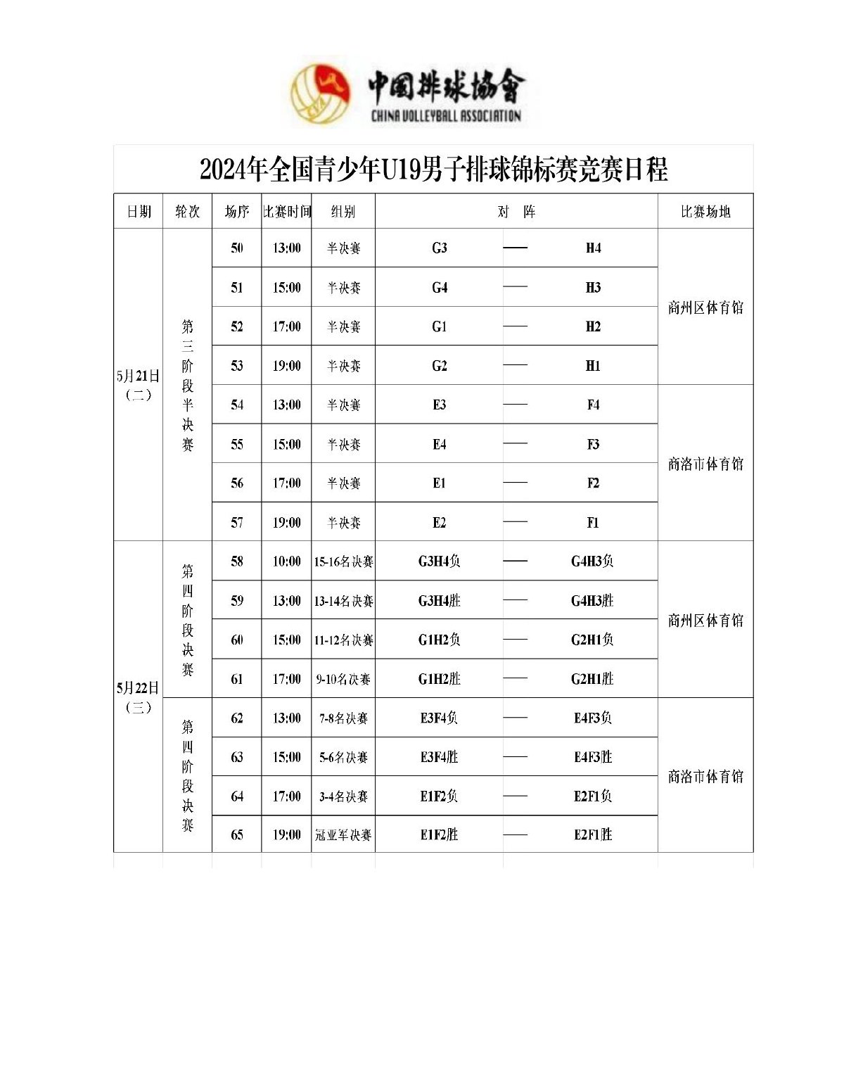 5月20日晚,2024年全國青少年U19男子排球錦標(biāo)賽在商洛結(jié)束第二階段交叉賽的爭奪,江蘇青年男排、天津青年男排、濟(jì)南大學(xué)城實(shí)驗(yàn)高級中學(xué)、浙江溫嶺新河中學(xué)晉級四強(qiáng)?! ?月21日,在商洛市體育館和商州區(qū)體育館舉...