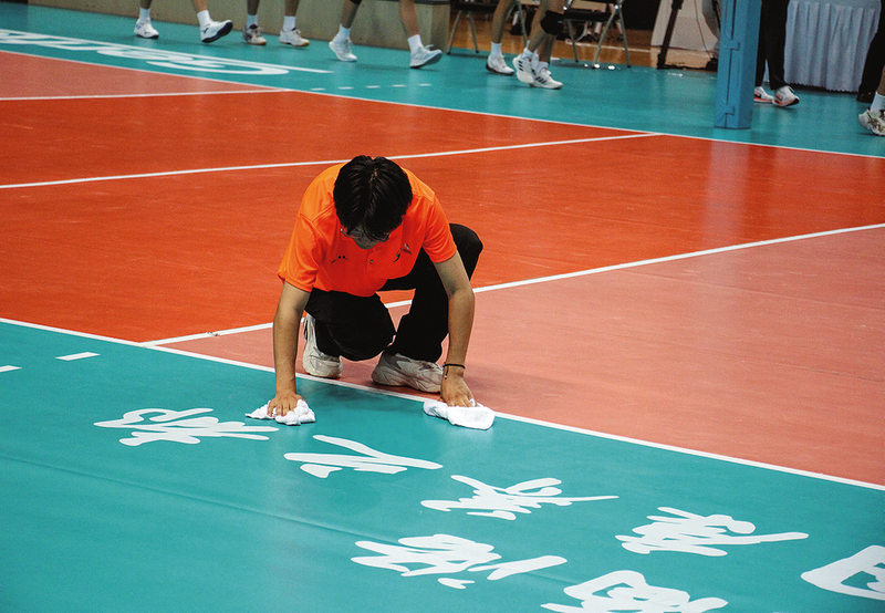 5月16日,比賽間隙,志愿者快速擦干地板上的汗水,防止運(yùn)動(dòng)員滑倒。