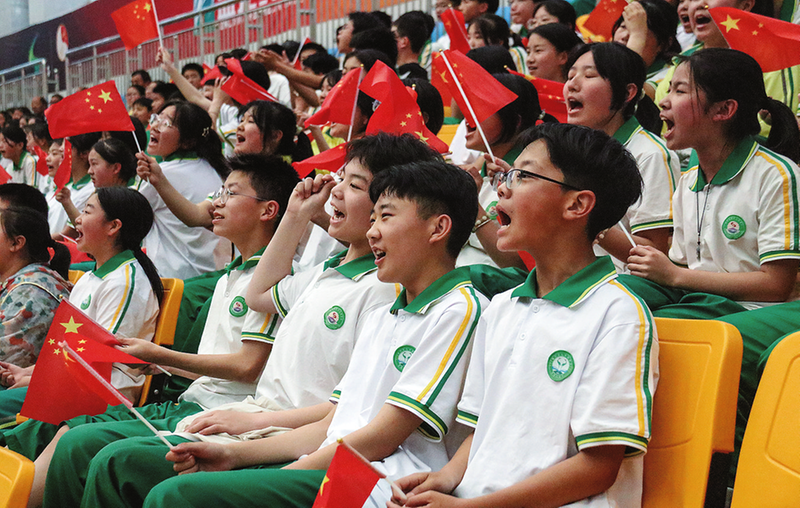 5月16日排球比賽中,商州區(qū)九年制學(xué)校的初中生為排球運(yùn)動(dòng)員助威吶喊。