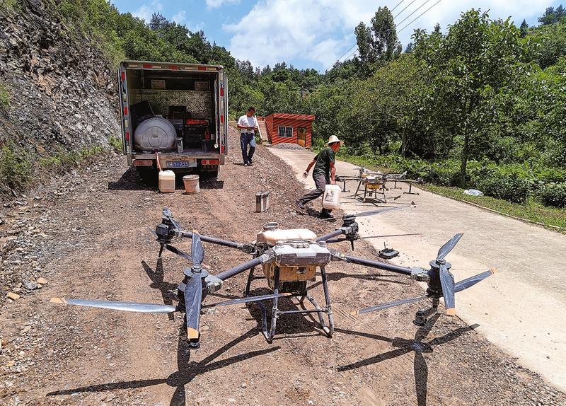 商洛天外天航空科技有限公司工作人員在商南縣富水鎮(zhèn),利用無人機為核桃園噴灑農(nóng)藥。