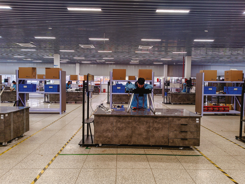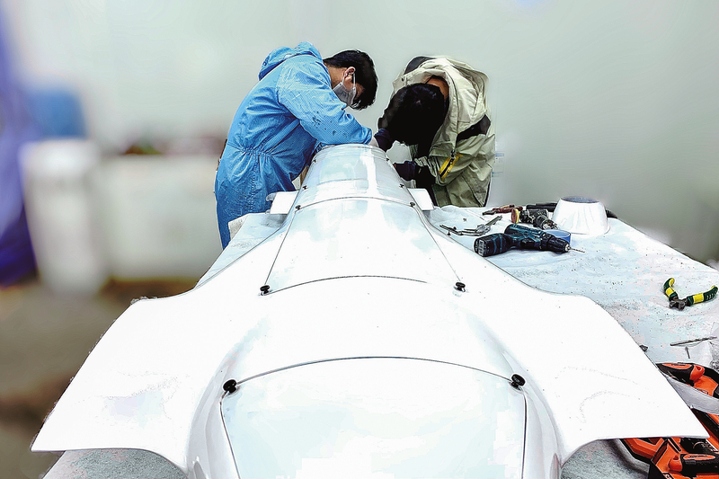 國飛領(lǐng)翼科技有限公司工作人員在生產(chǎn)廠房組裝無人機