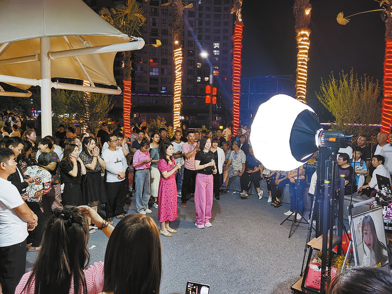 △5月7日晚,網(wǎng)紅在鎮(zhèn)安錦湖公園休閑廣場(chǎng)上直播,吸引眾多市民駐足觀賞。