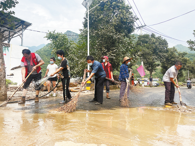 ?7月27日,山陽縣南寬坪鎮(zhèn)組建14支黨員突擊隊(duì)開展防汛救災(zāi)、道路清淤等工作。圖為洞溝村的突擊隊(duì)隊(duì)員帶領(lǐng)群眾清除道路堆積的淤泥,保證群眾安全出行。