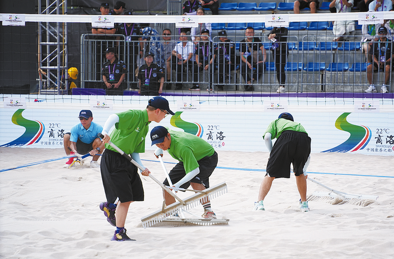比賽間隙,耙沙志愿者迅速平整場地,保障比賽順利進(jìn)行。(本報記者 米子揚(yáng) 攝)