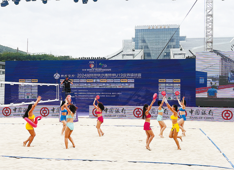 比賽間隙,沙排寶貝上演動感熱舞。 (本報記者 張 英 攝)