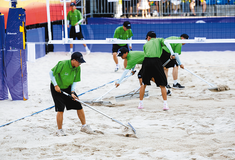 比賽間隙,沙排寶貝和志愿者表演啦啦操。