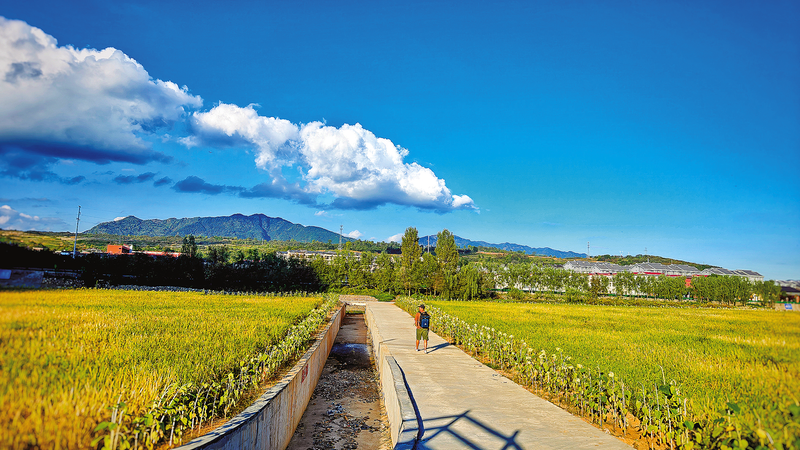 9月17日,洛南縣保安鎮(zhèn)農(nóng)業(yè)觀光園內(nèi),藍(lán)天、白云與黃綠色的稻田構(gòu)成一幅畫。