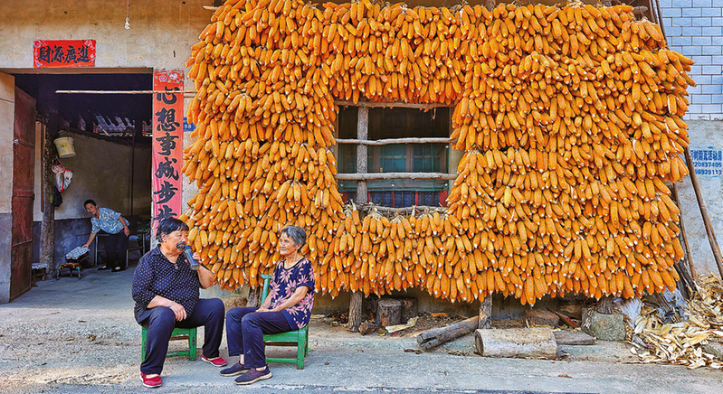 9月16日,商州區(qū)牧護關(guān)鎮(zhèn)一農(nóng)戶家,金色的玉米將房屋裝點得別有生趣。