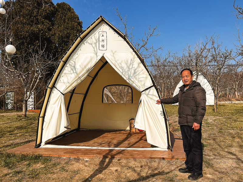 上河村農(nóng)耕體驗(yàn)園里,梯田沿山勢(shì)而上,層層疊疊,雖是隆冬,被單位和個(gè)人認(rèn)領(lǐng)的地塊仍有零星的綠意。凜冽的風(fēng)中,吳旭東凝眸回望,漫山的核桃樹(shù)、小塊菜地、白帳篷、草屋,鋪展成一幅渾然天成的多彩畫(huà)卷。